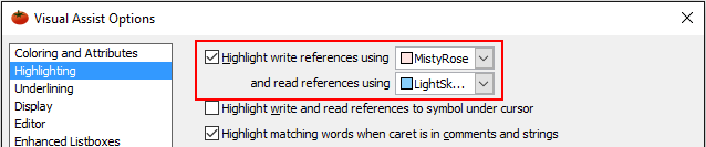 Highlighting occurs only with the color for read references, shared with Find References and Highlight References to Symbol Under Cursor.