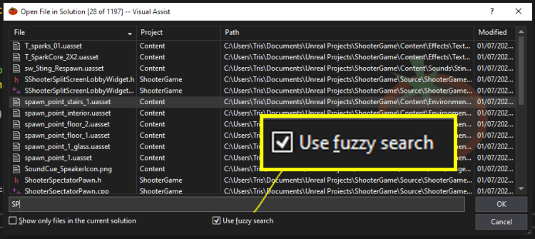 Visual Assist’s open file in solution and find symbol in solution will now employ this algorithm, so you can expect more results with fewer, less accurate search queries.