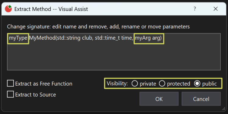 Visual Assist’s Extract Method feature now offers full parameter customization through an intuitive dialog interface. When extracting code into a new method, developers can now: