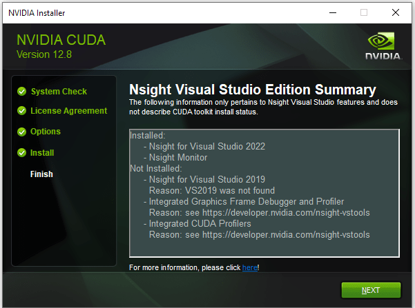 After downloading, run the installer. It will scan your device for any missing dependencies or pre-existing installs and adjust your installation files accordingly. Afterwards, you will now have the CUDA Toolkit installed on your system. Additionally, NSIGHT which provides debugging and profiling features specific for CUDA applications will also be installed.