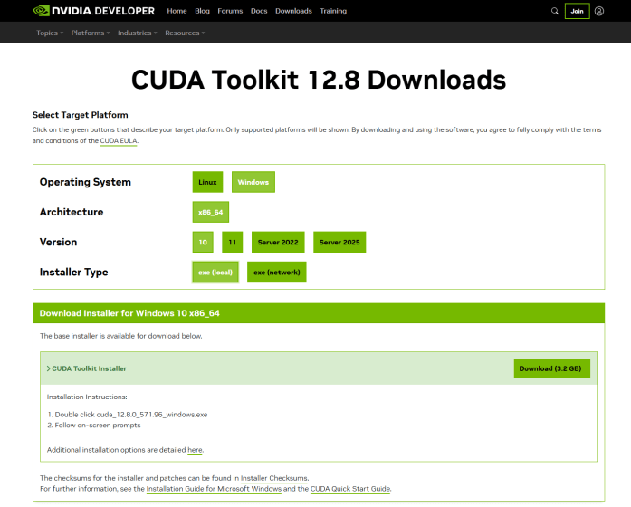 With Visual Studio now installed, you will need the CUDA Toolkit download for Visual Studio. It provides the tools, libraries, and compiler (nvcc) needed to develop and run CUDA applications within Visual Studio. It enables integration for GPU-accelerated computing, which allows use of NVIDIA GPUs for high-performance tasks.