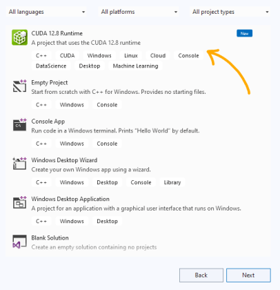 At this point you have two options: either start a completely blank console/project or choose the CUDA 12.8 project. The main difference is that the CUDA Runtime comes pre-equipped with the usual workloads, sample code, and use cases.However, starting from scratch allows you to configure your project with only what you need and it also familiarizes you with the workspace. For this project, we’ll start with a completely blank project. - Setting your build configuration