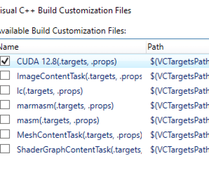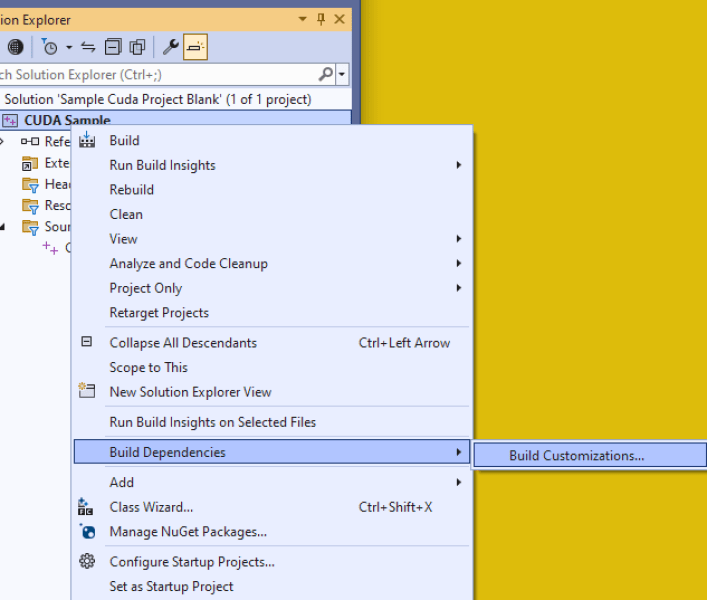 You need to ensure that Visual Studio knows that you’re trying to build and execute CUDA files. To configure this, right click on your project name (“CUDA Sample”) and click on Build Dependencies ? Build Customizations. A new window will pop up that lists down available build customization files—be sure to tick CUDA 12.8 and hit ok.