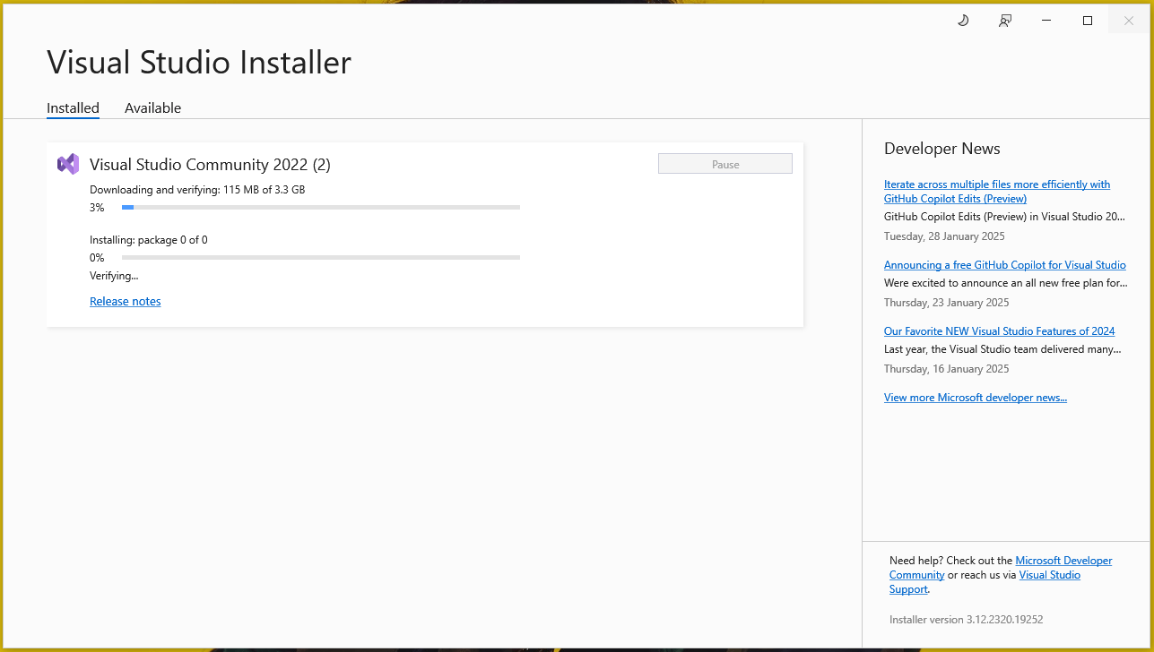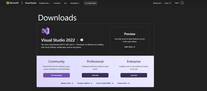 First, download Visual Studio from Microsoft. Choose whatever edition you prefer. For our installation, we downloaded a community version of Visual Studio 2022 for as it’s the latest supported version for our Windows 11 system. - Run the installer to complete the installation