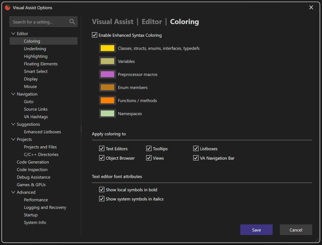 The Visual Assist Options dialog has been completely rebuilt with a modern UI framework, moving away from the legacy Win32 interface theme. This modernization represents the first step in a comprehensive UI refresh that will extend to other Visual Assist components in future releases.