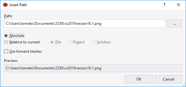 If the inserted path is to be relative, specify whether the path should be relative to the file being edited, its project, or its solution.