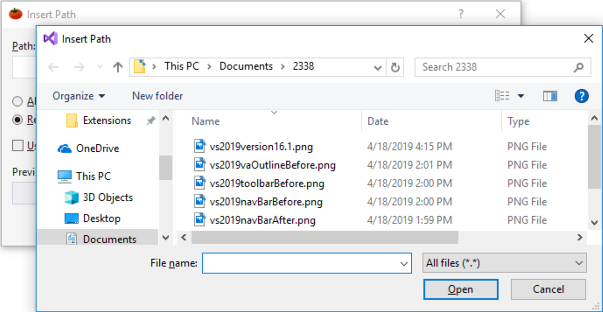Upon execution of Insert Path, a settings dialog opens, followed immediately by an open-file dialog. Use the open-file dialog to navigate to the file whose path is to be inserted.