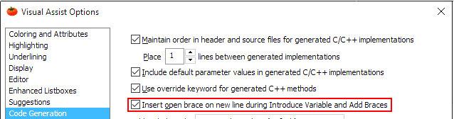 You can specify the location of open braces in the options dialog for Visual Assist.