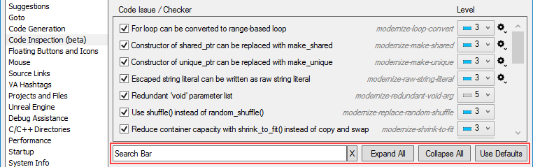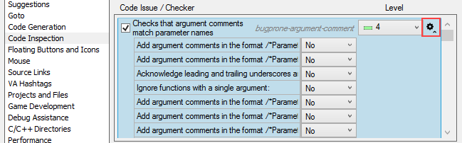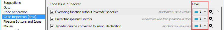 Code inspection levels represent roughly severity, with level one being critical and five a notice. Re-assign levels in the options dialog for Visual Assist.