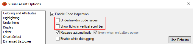 Individual code inspections can be enabled/disabled in the options dialog for Visual Assist.