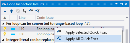 Displays all supported adjustments available for each code issue listed in the tool window.
