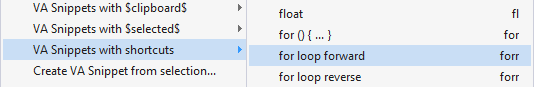 - From the "VA Snippets with shortcuts" submenu, select "for loop forward"