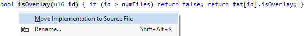 VA Snippets of type Refactoring comprise those related to the refactoring and code-generation features of Visual Assist, because any one such VA Snippet might serve several features. For example, the VA Snippet titled Create Implementation is used by Create Implementation as well as Move Implementation to Source File.