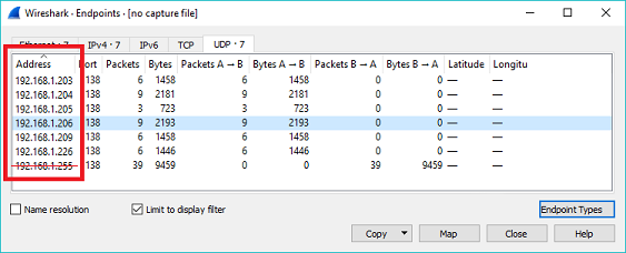 The following arguments instruct Wireshark to filter for packets related to Visual Assist and to open a convenient Endpoints window, which lists IP addresses once each.