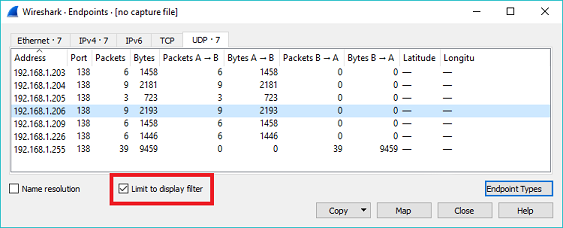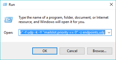 "%programfiles%\wireshark\Wireshark.exe" -f udp -k -Y "mailslot.priority == 0" -z endpoints,udp