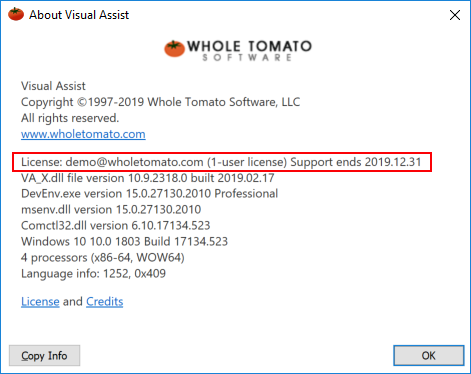 If you purchased a license of Visual Assist, or renewed maintenance, before mid-February 2019, you received a two-line activation key that identifies a license, user count, term of software maintenance, and hash-code that activates a genuine copy of Visual Assist.