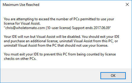 If a user who dismisses a licensed-exceeded message fails to exit his IDE, it can be difficult for a team to return to an allowed level of use. (The user who only dismissed the message may claim he is not running Visual Assist.) The exceeded-use scenario can be avoided by obtaining the appropriate number of licenses and a single, consolidated activation key for all developers who might use Visual Assist. (The EULA for Visual Assist does not permit licenses to float among developers.)