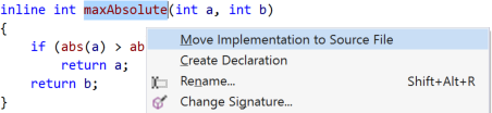 Refactoring with Move Implementation to Header File provides C/C++ users with an efficient means to move the implementation of a function to a header file. Similarly, Move Implementation to Class Declaration moves the implementation of a method inside its class declaration.