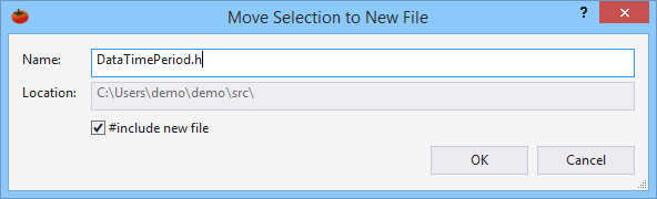 In the dialog that opens, enter a file name for the destination—a file that cannot exist. If the destination is a header file, you have the option of including the new file in the current file.