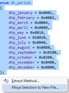 To move into a new file, select one or more entire lines, then choose Move Selection to New File from the Quick Action and Refactoring menu (Shift+Alt+Q).