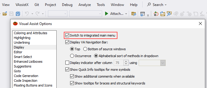 Select Display and enable the Switch to integrated main menu option to rearrange the Visual Studio main toolbar. Move the Visual Assist menu from the Extensions menu item and place it into the top-level menu. This provides easy access and navigation.