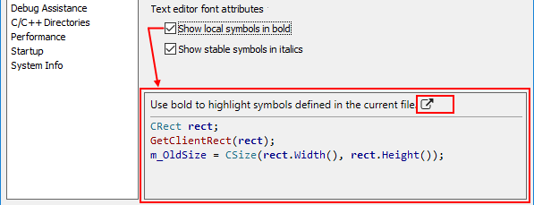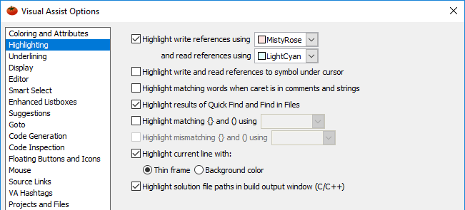 The options dialog has several nodes that provide control of coloring, editing, setup, performance, and more. Screenshots in documentation generally reflect the options dialog in the latest build of Visual Assist.