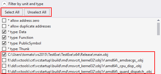 You can also constrain the set of symbols available for browsing by unit in which they are located, where unit is an object file or DLL. (A unit of "none" implies the PDB does not identify the source of the symbol.) The select-all and unselect-all buttons above the built-in filters affect only the units. Select-all to browse within all units. Unselect-all and then select one or more modules to limit the browsing.