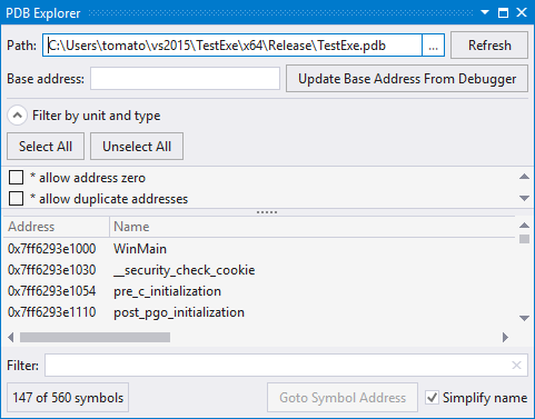 If PDB Explorer is running in an instance of Visual Studio attached to a process in debug mode, press "Goto Symbol Address" or Double-Click a symbol of type Function, PublicSymbol, or Thunk to make the debugger open the disassembly tool window at the location in virtual memory of the symbol; set breakpoints or modify code as allowed by the debugger. Double-click a symbol of type data to open the tool window at the location of symbol storage; examine or modify the value as allowed by the debugger.
