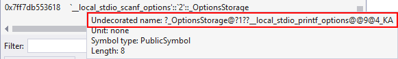 A readable version of the symbol name. Hover over a PublicSymbol to see the exported symbol's mangled, or undecorated, name.
