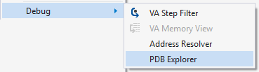 Open PDB Explorer using VAssistX | Debug | PDB Explorer (Alt+X, B, E). Like all tool windows, PDB Explorer can float or be docked.