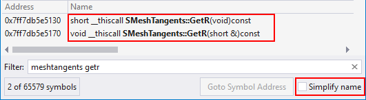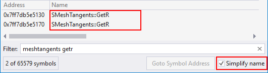 Select simplify-name at the bottom right of PDB Explorer to see only names of functions in the list of symbols.