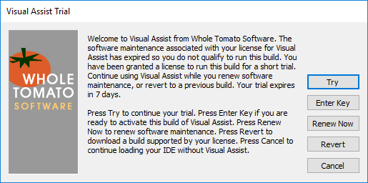 If your software maintenance for Visual Assist has expired and Visual Studio installed a version you are not qualified to run, Visual Assist will start in trial mode. After the short trial, you will need to obtain a current maintenance and support plan or revert to an old version of Visual Assist. (See below.)