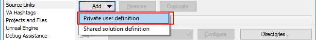 When no solution is open, Visual Assist allows only the creating of private user definitions, accomplished via the Add button on the Source Links page of the options dialog of Visual Assist.