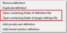 Convenient access to the files containing a shared link definition and its associated plug-in settings, i.e. those created in .va\shared\SourceLinks, is available via the context menu of the list of definitions. Because he file names contain GUIDs, the access is valuable when checking out a definition from source control. (Remember to check out the shared definition file and its plug-in settings file.)
