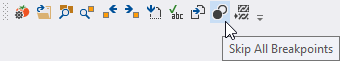 Visual Assist extends the debugging functionality of Visual Studio with a command to skip all breakpoints. When the command is executed, enabled breakpoints retain their enabled state but are automatically skipped, effectively disabling them. When the command is executed again, enabled breakpoints return to their default behavior, i.e. they break the application in the debugger. Hence with Visual Assist, disabled breakpoints in a single section of an application can be conveniently "toggled"—from breaking the application to not breaking it.