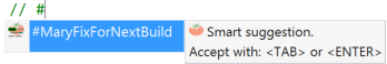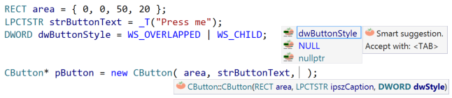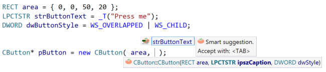 Smart Suggestions are highly context-aware code hints that speed development by suggesting text you're likely to type in the current context. With Smart Suggestions, C++ users enjoy autocompletion built into the IDE for C# users, and for C# users, Smart Suggestions become available in more scenarios.