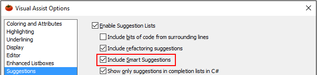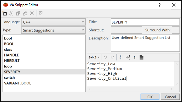 You can define a set of Smart Suggestions for use when assigning or comparing built-in or user-defined types. For instance, when working with HRESULTs, Visual Assist has built-in suggestions including S_OK and S_FALSE. You can add your commonly used HRESULTs to this list by modifying the VA Snippet "HRESULT". You can similarly add values to the other built in data types including class, HANDLE, loop, switch, bool, BOOL, and VARIANT_BOOL, as well as the loop and switch control structures. See VA Snippets for Smart Suggestions.