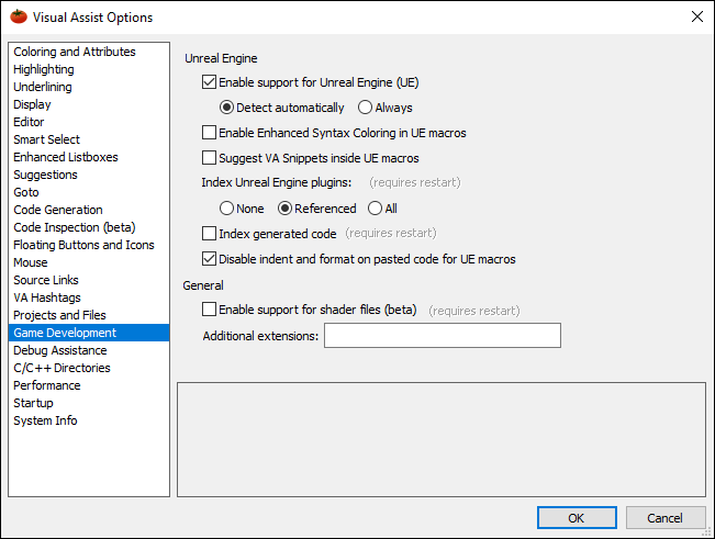 When you select support for UE, you can choose the Always option to enable functionalities for all your projects, or Detect automatically allowing Visual Assist to detect them when you are working on a UE project.