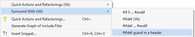 Surround With wraps selections with code specified in VA Snippets. The surrounding is available in several places in the UI of Visual Assist.