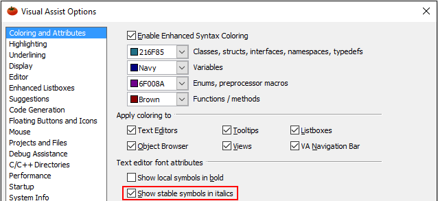 Visual Assist can display system symbols in italics within the text editor. The italics differentiate references to system symbols from those that have been overridden.