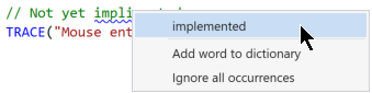 When you Right+Click a misspelled word, you have the option to add the misspelled word to a dictionary of user-defined words. The words are stored in plain text in UserWords.txt, in the \Dict subdirectory of the Visual Assist installation directory. You can also populate UserWords.txt with any text editor—one word per line.
