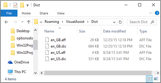 7. Copy the dic and optional aff files from the uncompressed archive to the \Dict subdirectory of the Visual Assist installation directory: