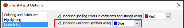 Select the color of underlining in the Visual Assist options dialog.