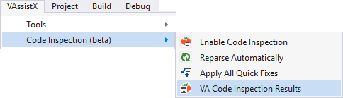 Use the VA Code Inspection Results tool window to see all code issues in the active file. Open the VA Code Inspection Results tool window via the VAssistX menu.