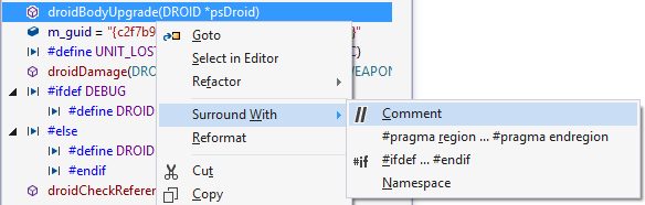 Surround With opens a small submenu of stubs and VA Snippets that might be applied to the current selection in the VA Outline. The comment stub applies a style appropriate to the language. The submenu does not include all VA Snippets that contains $selected$, because most of them are not applicable at the scope of entries in the VA Outline.