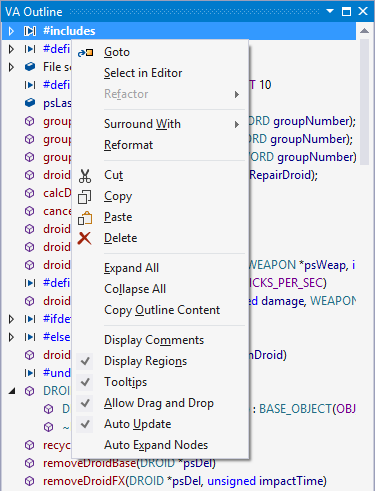 Most interaction with the VA Outline is accomplished via its context menu.