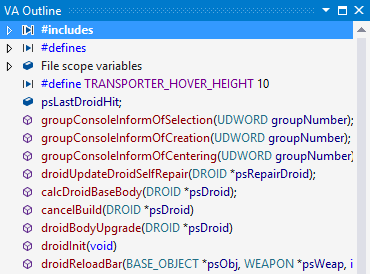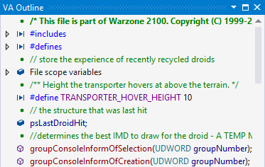 The VA Outline is a tool window of Visual Assist that provides a synchronized, high-level view of the contents of the current source window. The VA Outline automatically updates as you modify source, and edits made via the VA Outline are reflected immediately in the source window.