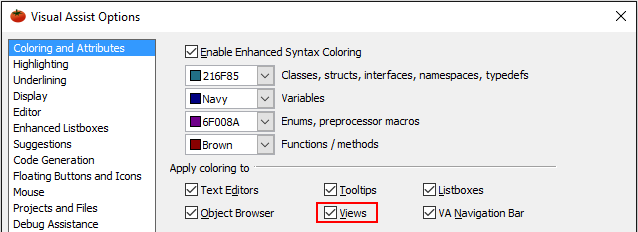 Coloring in the VA Outline requires coloring of views in the options dialog of Visual Assist.