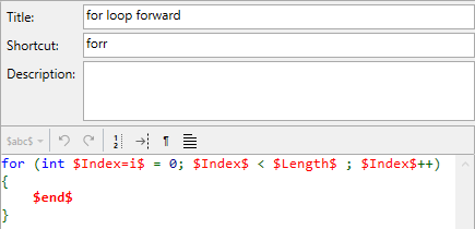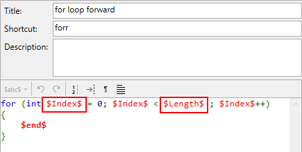 In the following example, the default VA Snippet for a simple for() loop includes two input placeholders.