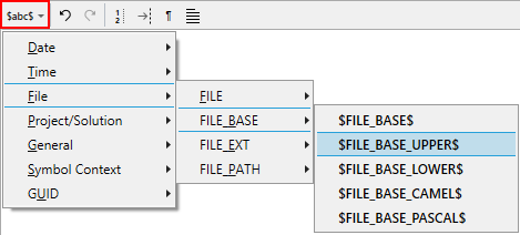 Many reserved strings have variants that expand to specific cases. The variants follow the names of the non-cased reserved strings. For example, the uppercase variant of $FILE_BASE$ is $FILE_BASE_UPPER$.